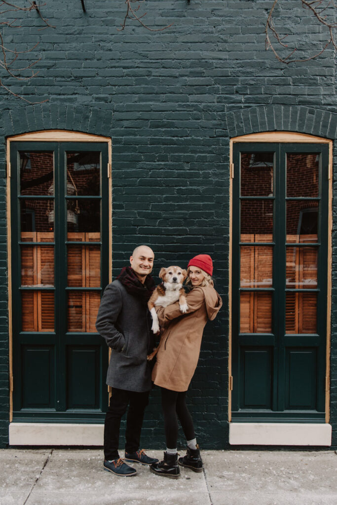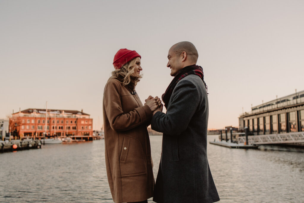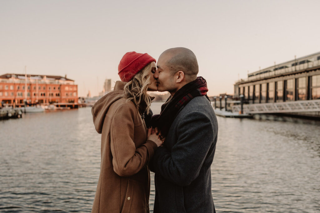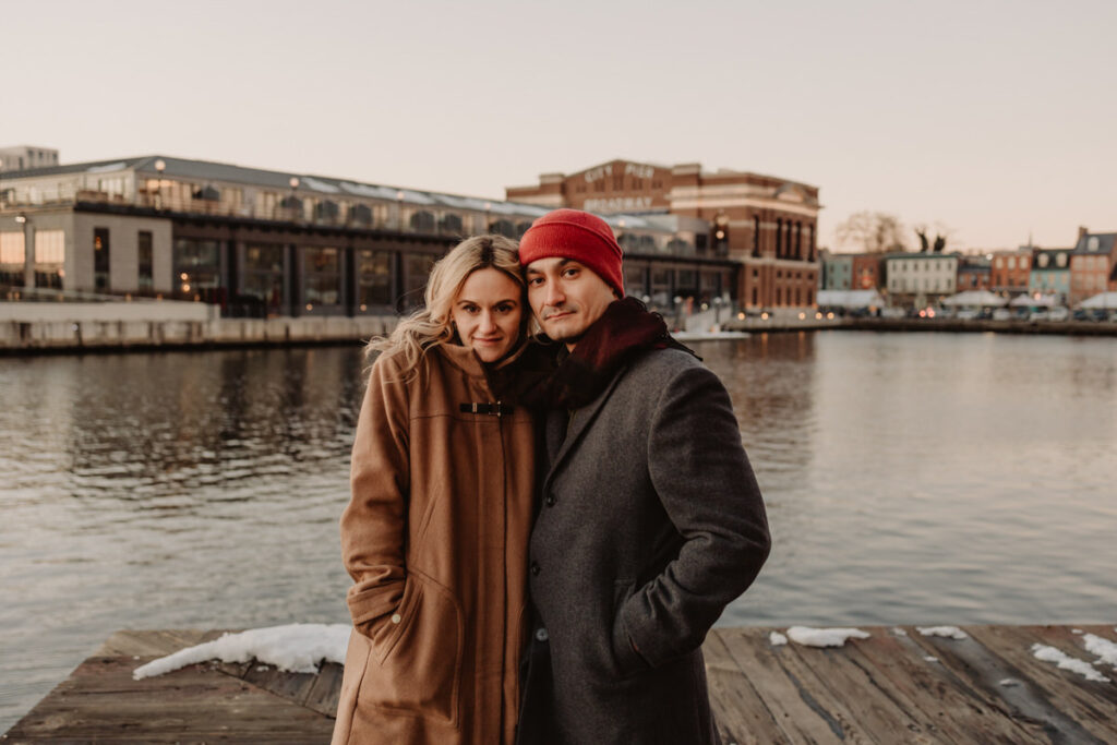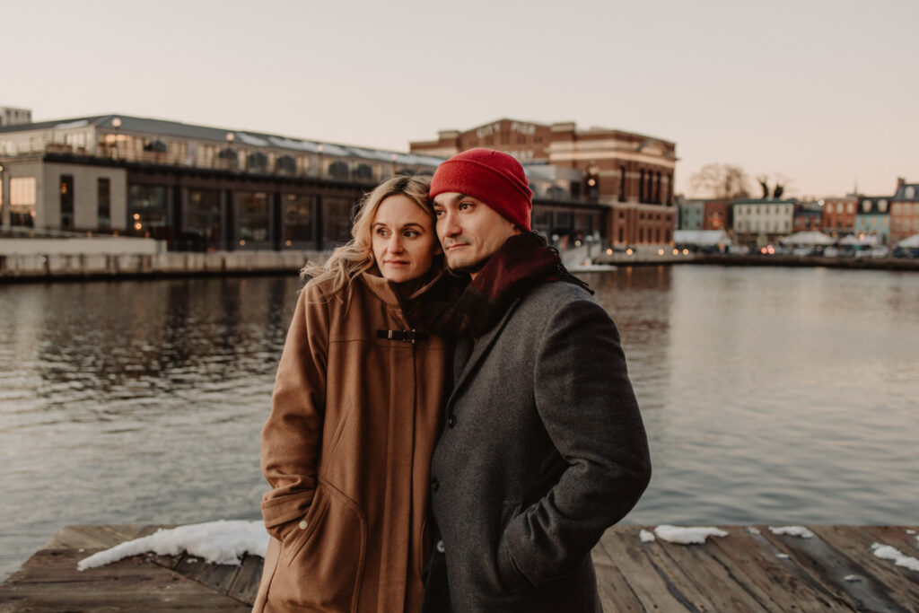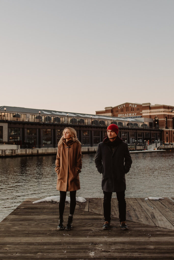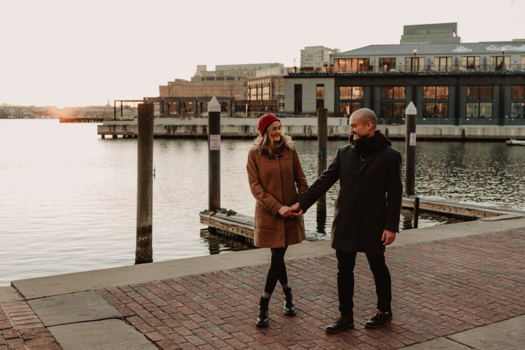 We met in Fells Point in front of the Sagamore Pendry, and decided to hop inside for a minute because we were already freezing before the session even started. We were able to get some cozy moody indoor shots and then some fun, romantic photos in the Sagamore Pendry courtyard. Once we warmed up we decided to have puppy Roux join the party, walked around the streets of Fells point and finished our session with water views and a wonderful wintery golden and blue hour.