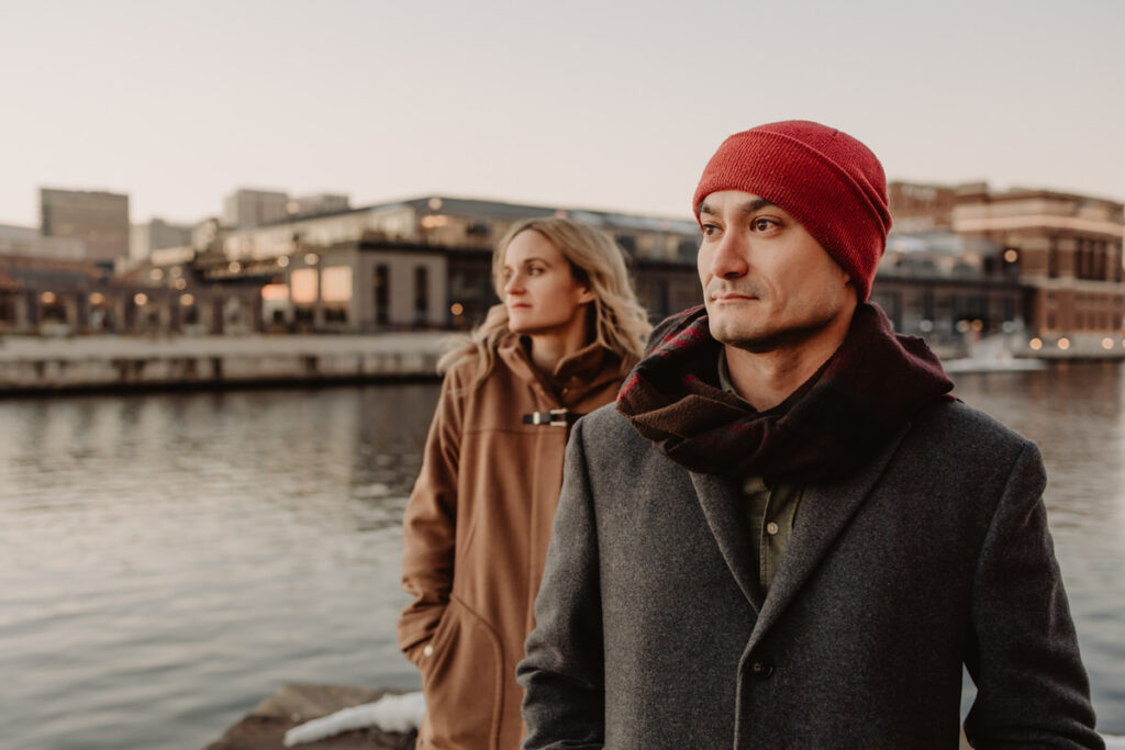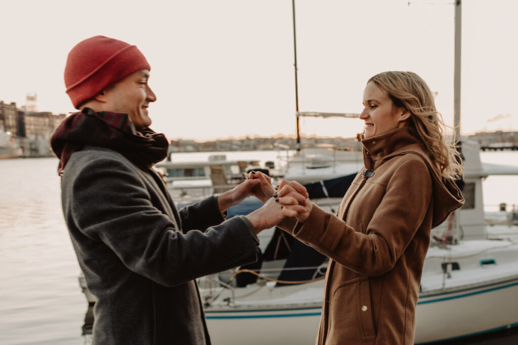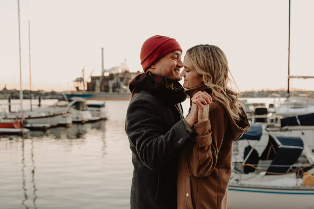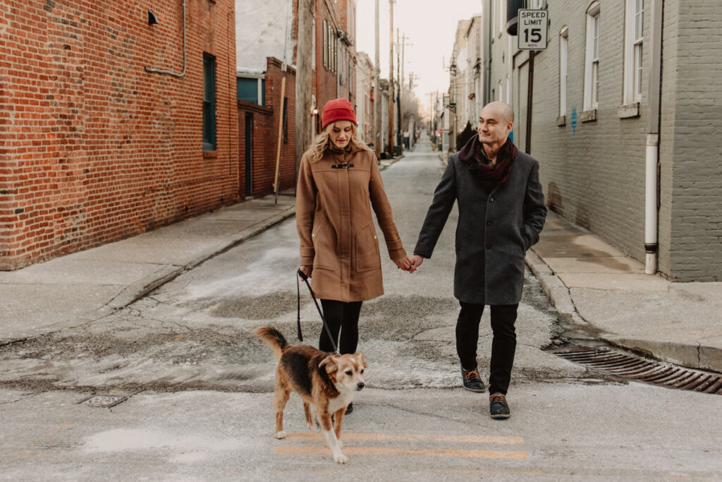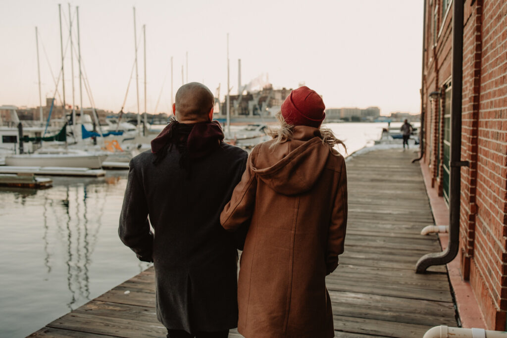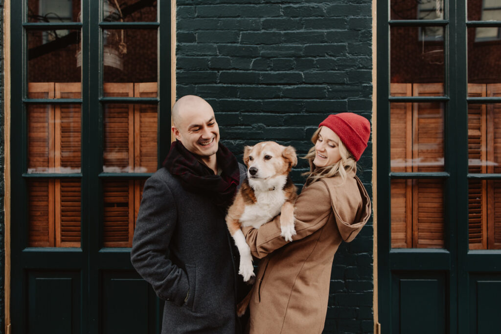 We met in Fells Point in front of the Sagamore Pendry, and decided to hop inside for a minute because we were already freezing before the session even started. We were able to get some cozy moody indoor shots and then some fun, romantic photos in the Sagamore Pendry courtyard. Once we warmed up we decided to have puppy Roux join the party, walked around the streets of Fells point and finished our session with water views and a wonderful wintery golden and blue hour.
