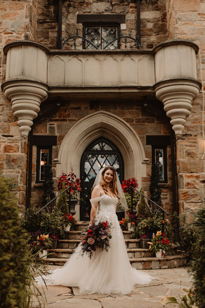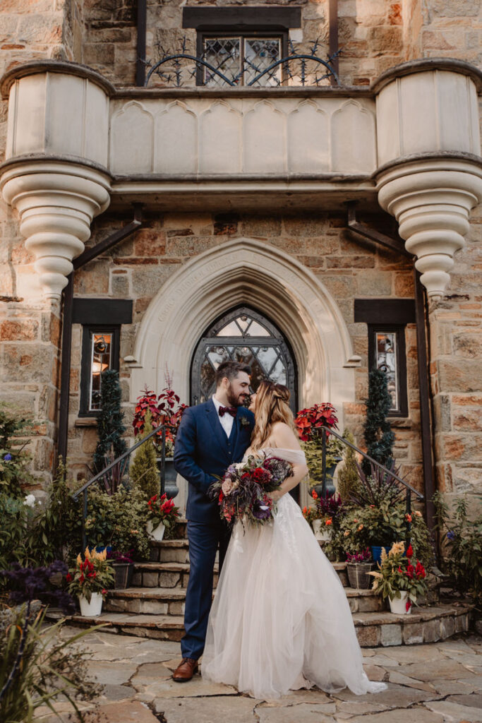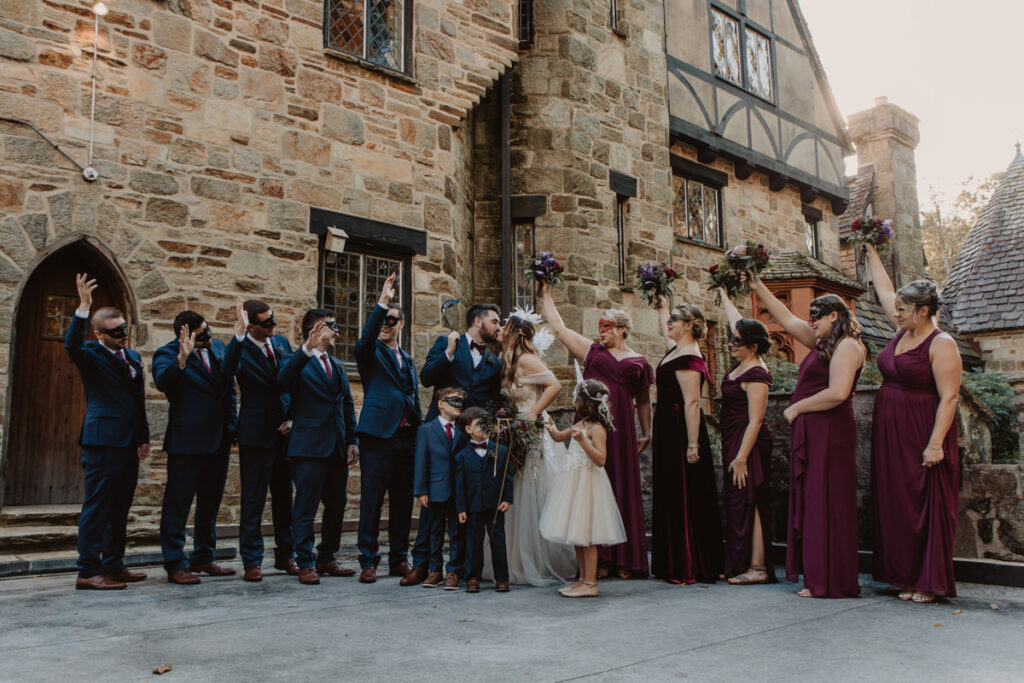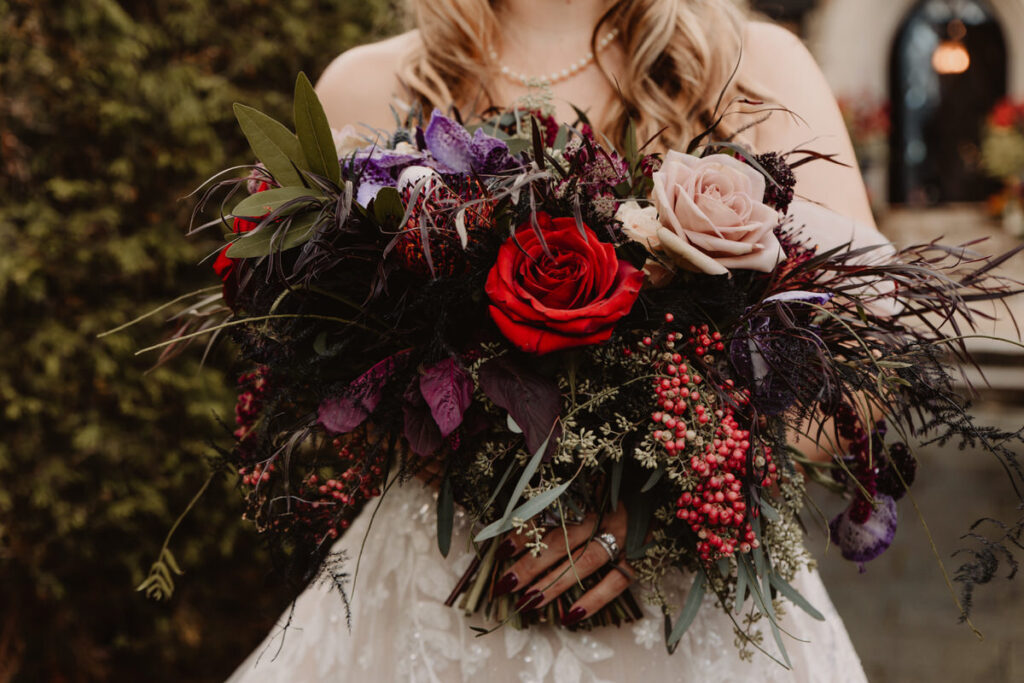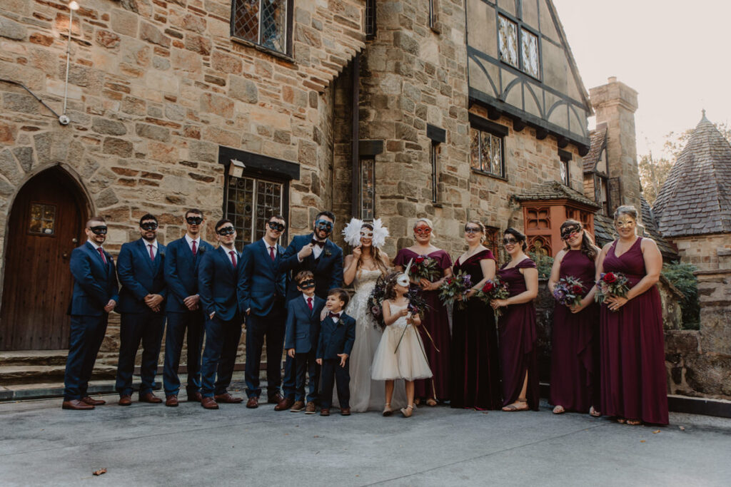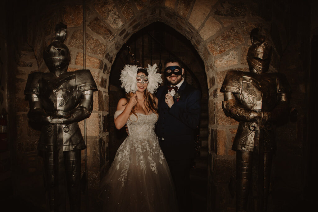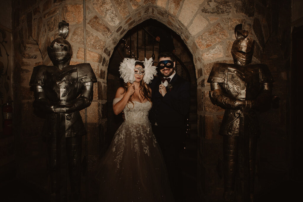 Paige and Cody somehow managed to incorporate a touch of Halloween into their wedding in a very classy and subtle way. Masks for the couple and the wedding party, plus being in a castle and a few guests who dressed up up for the occasion was all that was needed to create a tasteful Halloween flair. The floral arrangements by Crimson & Clover Floral Design added a little drama with their gorgeous fiery red and deep purple blooms.