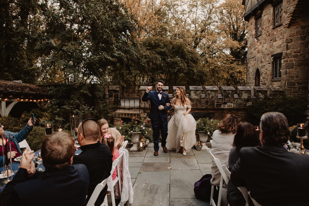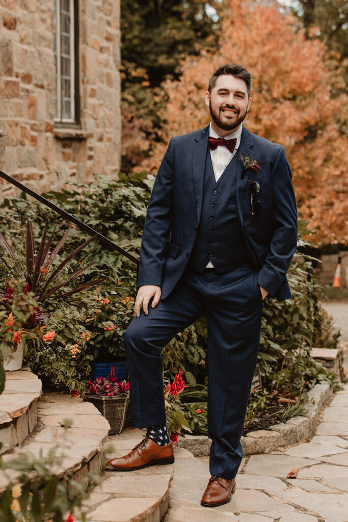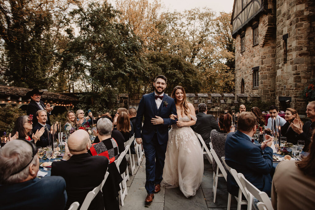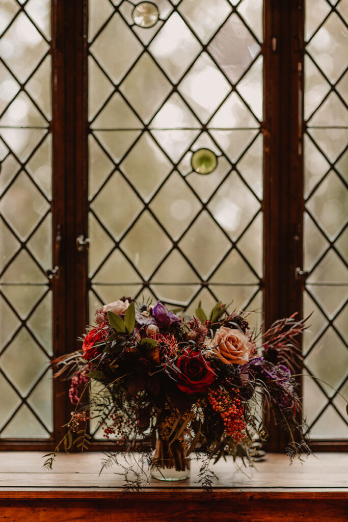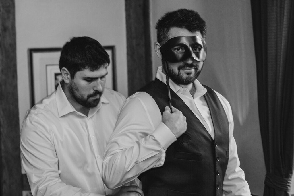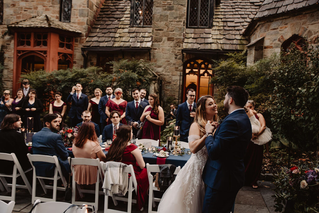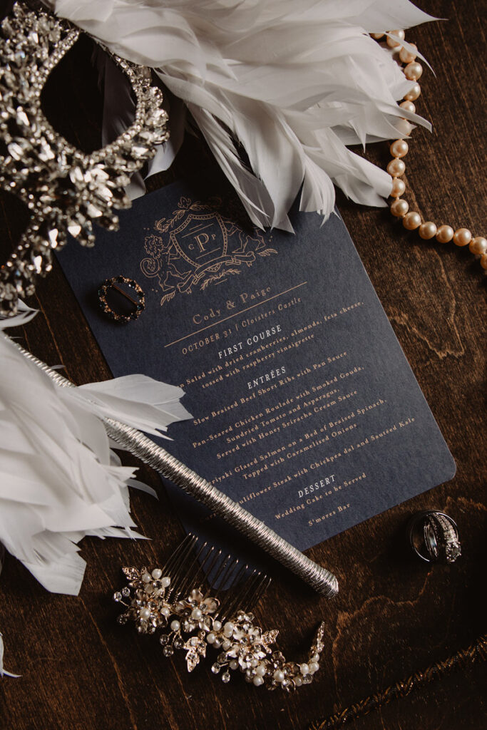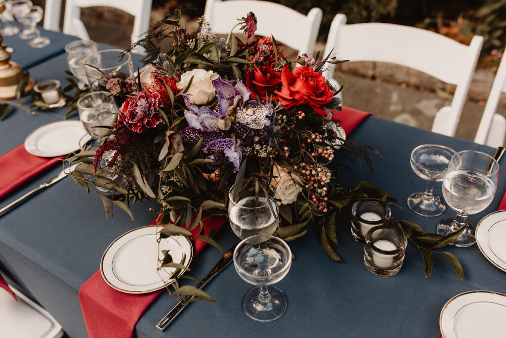 Paige and Cody somehow managed to incorporate a touch of Halloween into their wedding in a very classy and subtle way. Masks for the couple and the wedding party, plus being in a castle and a few guests who dressed up up for the occasion was all that was needed to create a tasteful Halloween flair. The floral arrangements by Crimson & Clover Floral Design added a little drama with their gorgeous fiery red and deep purple blooms.