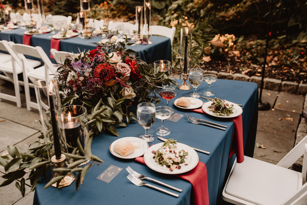 The ceremony was held outside on this beautiful October day and so was part of the reception. During cocktail hour the ceremony space was quickly turned into a romantic dinner location with a U shaped table arrangement which created an intimate and personal feel.